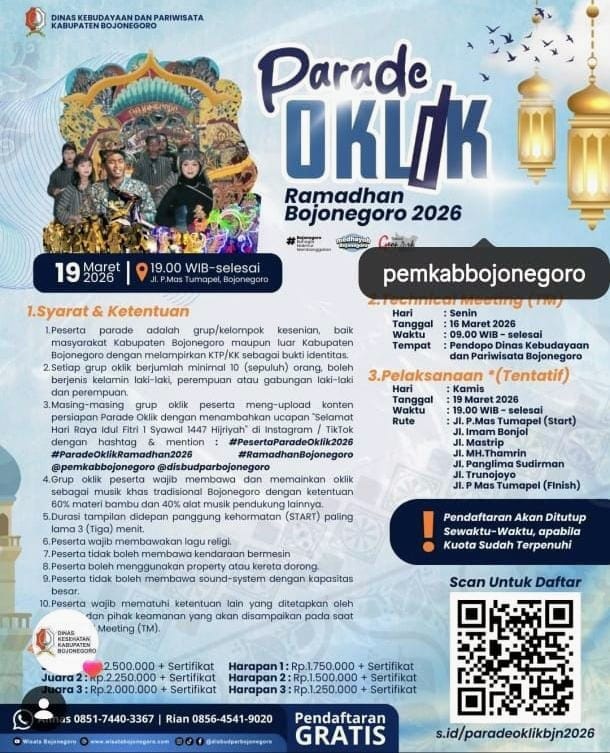 BOJONEGORO – Pemerintah Kabupaten Bojonegoro melalui Dinas Kebudayaan dan Pariwisata akan menggelar Parade Oklik Ramadhan 2026, sebuah agenda budaya yang bertujuan menghidupkan kembali tradisi musik bambu khas masyarakat Bojonegoro sekaligus menyemarakkan bulan suci Ramadhan.